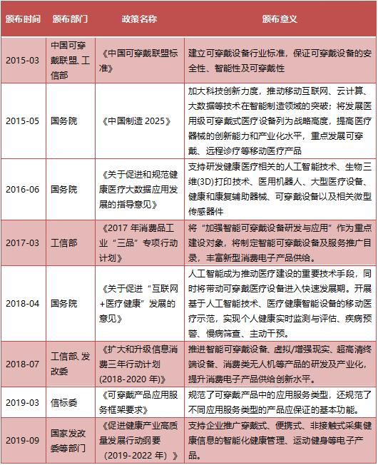自2014年,中国工程院启动“中国全平易近健康取医药卫生事业成长计谋研究”项目,并将“医疗器械取新型穿戴医疗设备的成长计谋研究”做为沉点研究课题。陪伴智能可穿戴设备正在医疗范畴的劣势逐步凸显,对于医用级智能可穿戴设备的注沉程度逐步加深。2015年,国务院印发《中国制制2025》,强调要提高医疗器械立异能力和财产化程度,鞭策挪动互联网、云计较、大数据等手艺正在智能制制范畴的冲破,沉点成长可穿戴、近程诊疗等挪动医疗产物,智能可穿戴设备上升为国度计谋。
