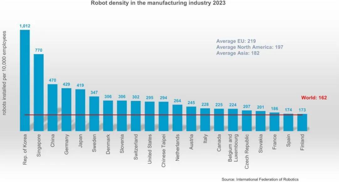 2023年的数据显示,中国的机械人密度已达到每万名工人470台,不只远超美国的295台,还一举超越了保守制制业强国(429台)和日本(419台),仅次于韩国和新加坡,位列全球第三。