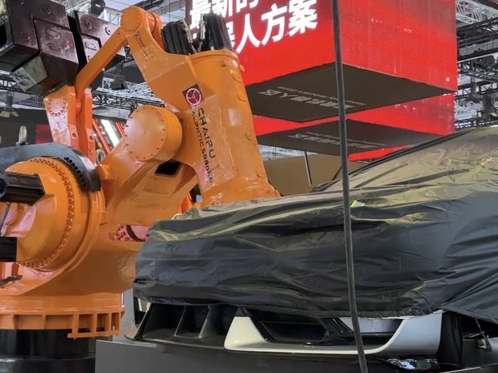 正在柴孚机械人展区,一台沉载工业机械人托举着被黑色车罩笼盖的汽车。该产物为柴孚机械人全球首发的沉载工业机械人,其腕部额定载荷跨越5吨,是名副其实的鼎力士。